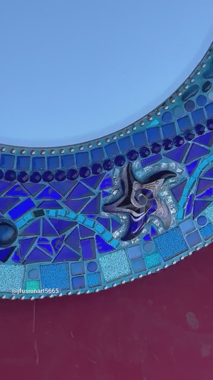 Elevate your space with this exquisite 18" Mosaic Mirror in shades of blue and aqua-teal with a touch of silver. The 10" beveled professional quality mirror is encircled by faceted glass Czech beads and fused glass, creating an ocean inspired design. Note the metallic lampworked large starfish that provides a touch of elegance. Mosaic tiles in glitter and mirror further enhance its captivating beauty. Upgrade your home with this stunning piece today!